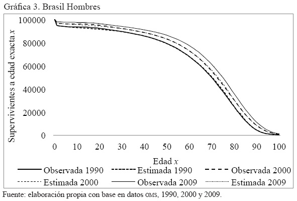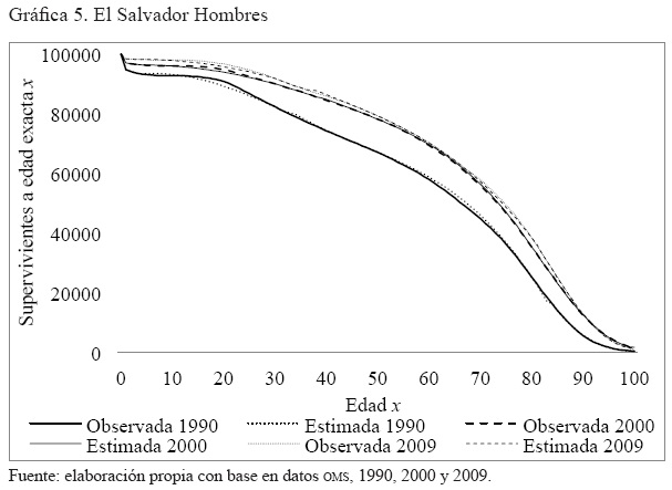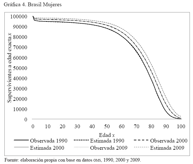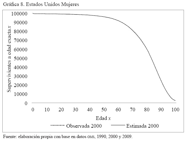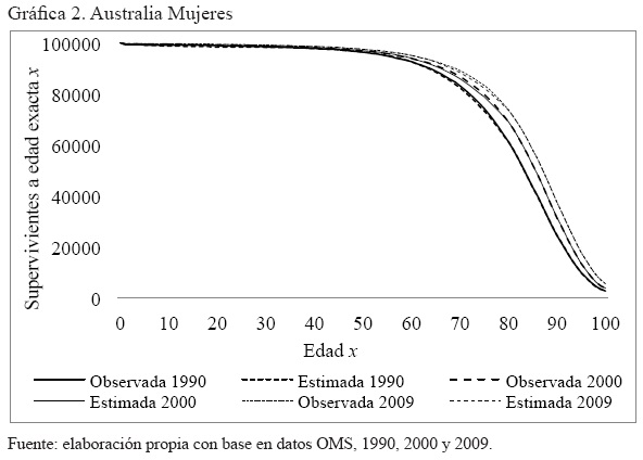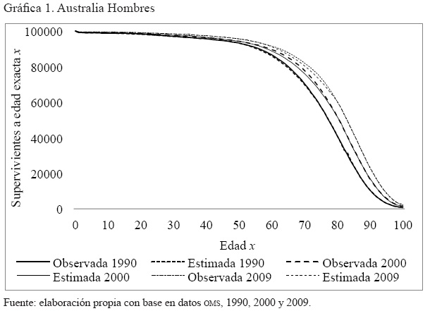 Anexo 4. Gráficas por año de la comparación de la serie de supervivientes a edad exacta x, observada y ajustada, hombres y mujeres. Australia, Brasil, El Salvador y Estados Unidos. 1990 2000, 2005 y 2009