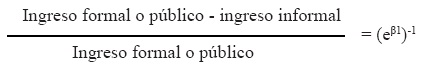 Los coeficientes (β) generados a través del ajuste de los modelos 1 y 2 para estimar el efecto sector y segmentos sobre los ingresos laborales horarios fueron empleados para calcular las brechas de los ingresos logarítmicos. Aplicando algunas porpiedades de los logaritmos, la brecha puede expresarse como: