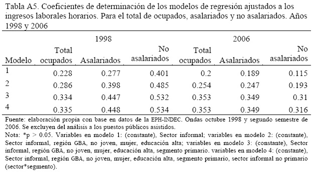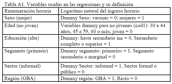Para las regresiones se consideró al universo de ocupados que declaran ingresos laborales horarios y excluyendo a los ayuda familiar sin salario. Se prefirió no incluir a quienes no declaran ingresos ya que para su estimación se emplean habitualmente las variables cuya importancia queremos analizar en este documento, lo que podría aumentar artificialmente el poder explicativo de nuestro modelo. Por las mismas razones, se prefirió modelar sin ponderar los datos finales de la base.