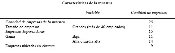La muestra seleccionada de empresas no tuvo ánimo de representatividad estadística, sino que se dirigió principalmente hacia aquellas que, a priori, en función de la literatura existente, aparecieran como las más dinámicas del encadenamiento. De este modo, la muestra se orientó hacia las que mostraran mayor inserción y dinámica exportadora, hubiesen participado en experiencias asociativas o estuvieran localizadas en los principales polos muebleros de Cañada de Gómez y Esperanza. La muestra incluyó a 10 de las 15 primeras empresas exportadoras de muebles de madera, al menos una empresa participante en las experiencias asociativas existentes en la industria de muebles argentina y seis de cada uno de los principales polos muebleros.