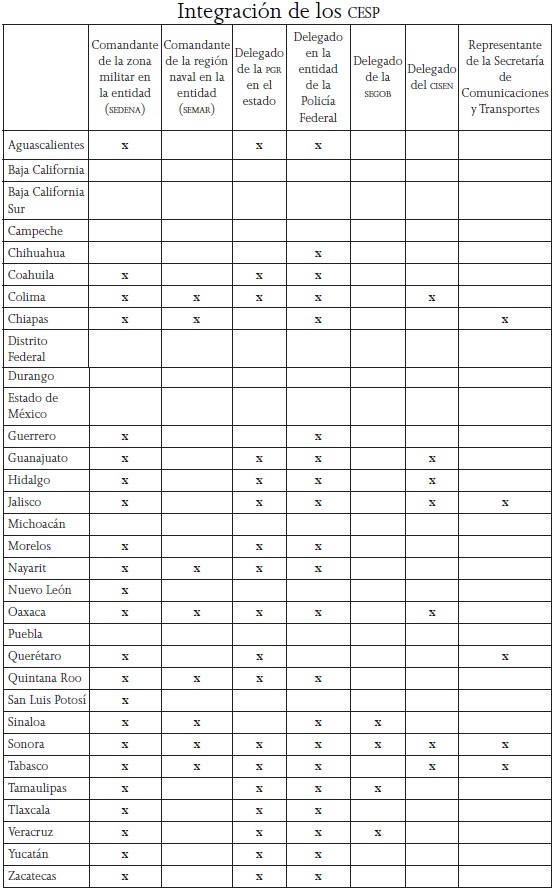 Además, en su mayoría, a representantes en el estado de las dependencias del gobierno federal que conforman el CNSP de la siguiente manera:18