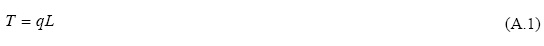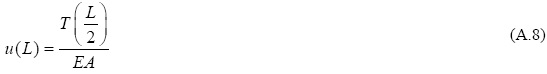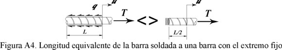 La Ec. A.7 permite valuar la elongación en el extremo de la barra soldada. Si reemplazamos la Ec. A.1 en A.7 se obtiene la Ec A.8, la que muestra que la elongación u(L) se valúa en términos de la fuerza actuante T y de la longitud L/2. Esto permite definir para la barra soldada de longitud L una longitud equivalente en una barra sin soldar con un extremo fijo igual a L/2. La Figura A4 muestra de manera gráfica la equivalencia entre una barra soldada, con carga distribuida q en un longitud L, con otra sin soldar de longitud L/2 con extremo fijo, en la que actúa T, y sin carga q.