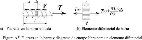 La Fig A3(a) muestra las fuerzas actuantes en la barra soldada, y en un elemento diferencial de barra, Fig A3(b). Del equilibrio de este elemento diferencial se obtiene: