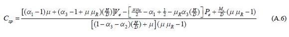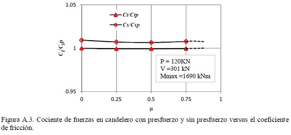 La figura A.3 muestra la relación entre las correspondientes fuerzas de la cimentación sin presfuerzo y con presfuerzo, para las fuerzas en el borde superior, Cs/Csp, las fuerzas en el fondo de la cimentación, Ctp/Ct. Los resultados calculados indican que para valores de μ menores que 0.75, las fuerzas, en ambos tipos cimentación, son prácticamente iguales y difieren en valores menores que 2%.