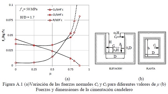 La figura A.1.a muestra las relaciones Cs/bHf'c, Ct/bHf'c y R//bDf'c obtenidas con las Eqs A.2 a A.4, para un espécimen típico sin presfuerzo para los elementos mecánicos máximos alcanzados en la columna del espécimen. Esta relaciones se muestran en función del coeficiente de fricción, μ. Estos resultados muestran que es razonable considerar que Cs y Ct tienen valores semejantes, así como que los valores de la fuerza de reacción vertical en la base de la columna en contacto con la cimentación, R, son bastante menores que los valores de la fuerzas normales Cs y Ct especialmente para valores de μ menores que aproximadamente 0.5, figura A.1a. La figura A.1b. muestra la elevación y planta de la cimentación candelero donde se indican las fuerzas de reacción y las dimensiones (b, D, H) donde se introduce la columna en el interior de la cimentación.