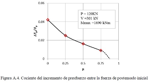 La figura A.4 muestra el cociente del incremento de la tensión en el cable de postensado, ΔTP, entre la fuerza de presfuerzo inicial, Fp, en función al coeficiente de fricción, μ, en el que se puede observar que este incremento es poco importante, menor que 5% de Fp.