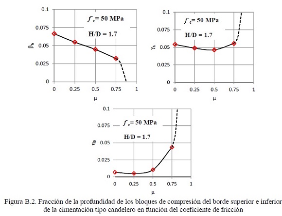 La figura B.2 muestra la variación de los parámetros βh, definido como la fracción de la profundidad del bloque de compresión en el borde superior de la cimentación tipo candelero, ver figura B.1, y del parámetro γh, ver figura B.1. Esta variación es función de la deformación máxima en compresión en el borde superior de la cimentación, εc, cuyo valor máximo es εcu. Los resultados mostrados en la figura B.2 se obtuvieron considerando requisitos de equilibrio, así como de compatibilidad de deformaciones. Como se aprecia en la figura B.2 los parámetros βh y γh tienden a ser en promedio igual a 0.05 para valores de μ en el intervalo 0 a 0.75.mientras que el parámetro ηD es del orden de 0.01 y crece a valores mayores que 0.05 para valores de μ mayores que 0.75.