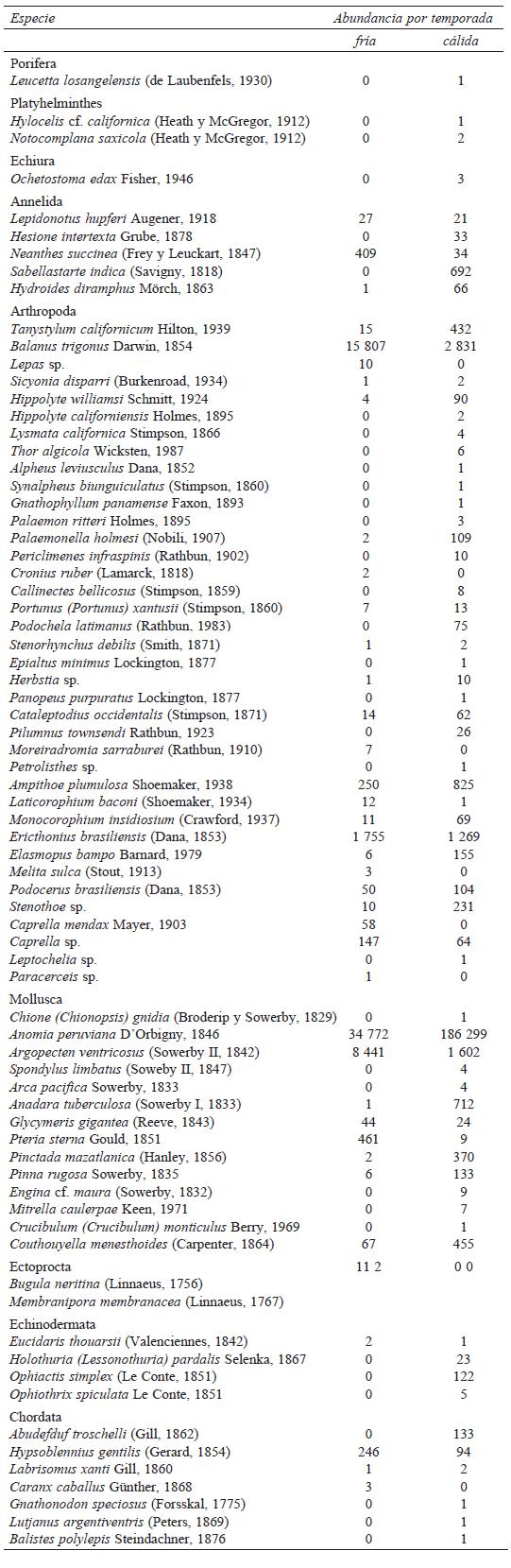Apéndice 1. Abundancia por temporadas de la fauna registrada en sustratos artificiales suspendidos en playa Guadalupe, bahía Concepción, Baja California Sur, México.