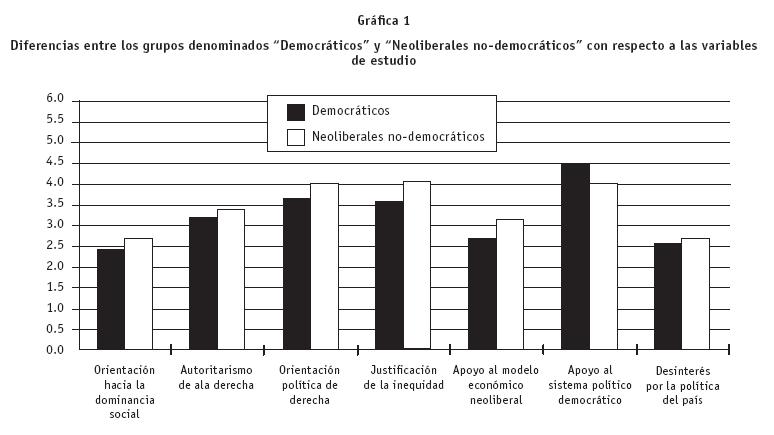 Diferencias estadísticamente significativas (p ≤ 0.05) se encontraron sólo en los puntajes promedio de la SDO, la Orientación Política de Derecha, la Justificación de la Inequidad, el Apoyo al Modelo Económico Neoliberal y el Apoyo al Sistema Político Democrático. Todas las variables están en una escala del 1 al 6, salvo el Desinterés por la Política del País que está en una escala de 1 a 4.