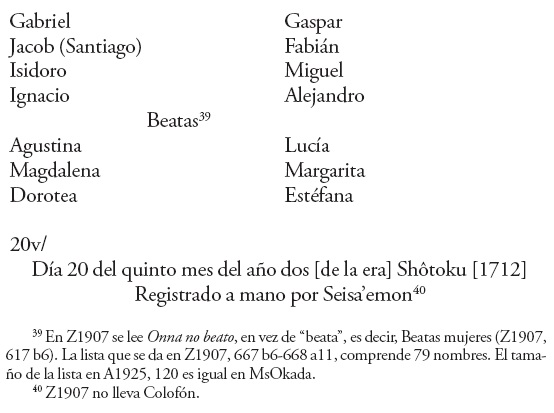 38 En Z1907 se lee Otoko no beato, es decir, Beatos varones (Z1907, 616 a7; A1925, 130). La lista que se da en Z1907, 666 a6 667 b5, comprende 184 nombres (algunos de ellos repetidos). El tamaño de la lista en A1925, 120 es igual en MsOkada.