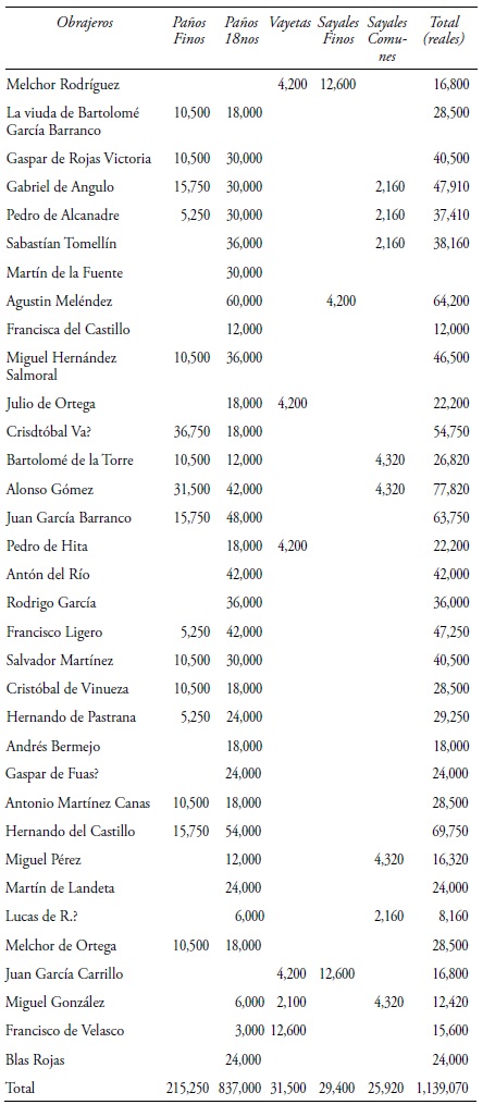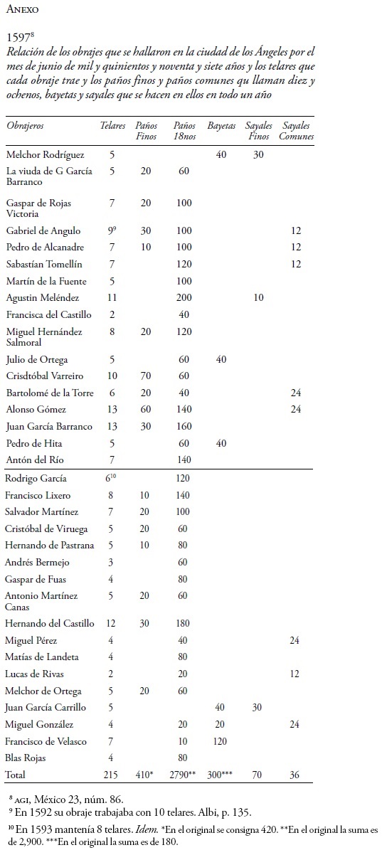 Parece haberse hallado en la ciudad de los Ángeles por el mes de junio de noventa y siete años treinta y cuatro obrajeros que traen 215 telares y hacen en ellos cuatrocientos y veinte paños finos, dos mil novecientos paños comunes diez y ochenos, ciento ochenta bayetas, setenta sayales finos y ciento y cuarenta y cuatro sayales comunes. El valor de esta ropa de presente es de cuatro" [sic] pesos. La vara de los paños finos a quince reales; los diez y ochenos a siete reales y medio. Las bayetas a cinco reales y medio; los sayales finos a tres reales y medio; los comunes. Pero lo que ordenanza mediante suele correr es a tres pesos y medio. Los paños finos a trece reales; los diez y ochenos a cinco reales y medio; los sayales finos a siete reales; las bayetas a tres reales los sayales comunes [sic].