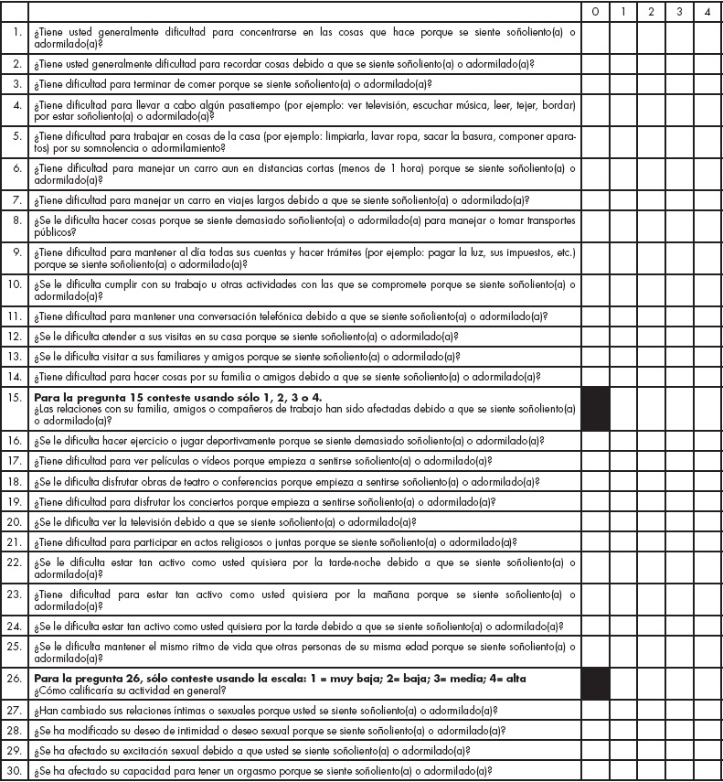 Nota: En este cuestionario se usan las palabras "soñoliento" o "adormilado" para describir la sensación de no poder mantener los ojos abiertos, pesadez en la cabeza, de cabeceo o sentir la necesidad de tomar una siesta. Estas palabras no se refieren a la sensación de cansancio o fatiga que pueda Usted tener después de hacer ejercicio.