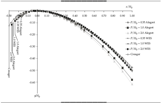 Apéndice IV. Coordenadas adimensionales de la cresta del vertedor de abanico obtenidas por Alegret, y su comparación con las coordenadas adimensionales de la cresta de los vertedores rectos en planta tipo Creager y WES