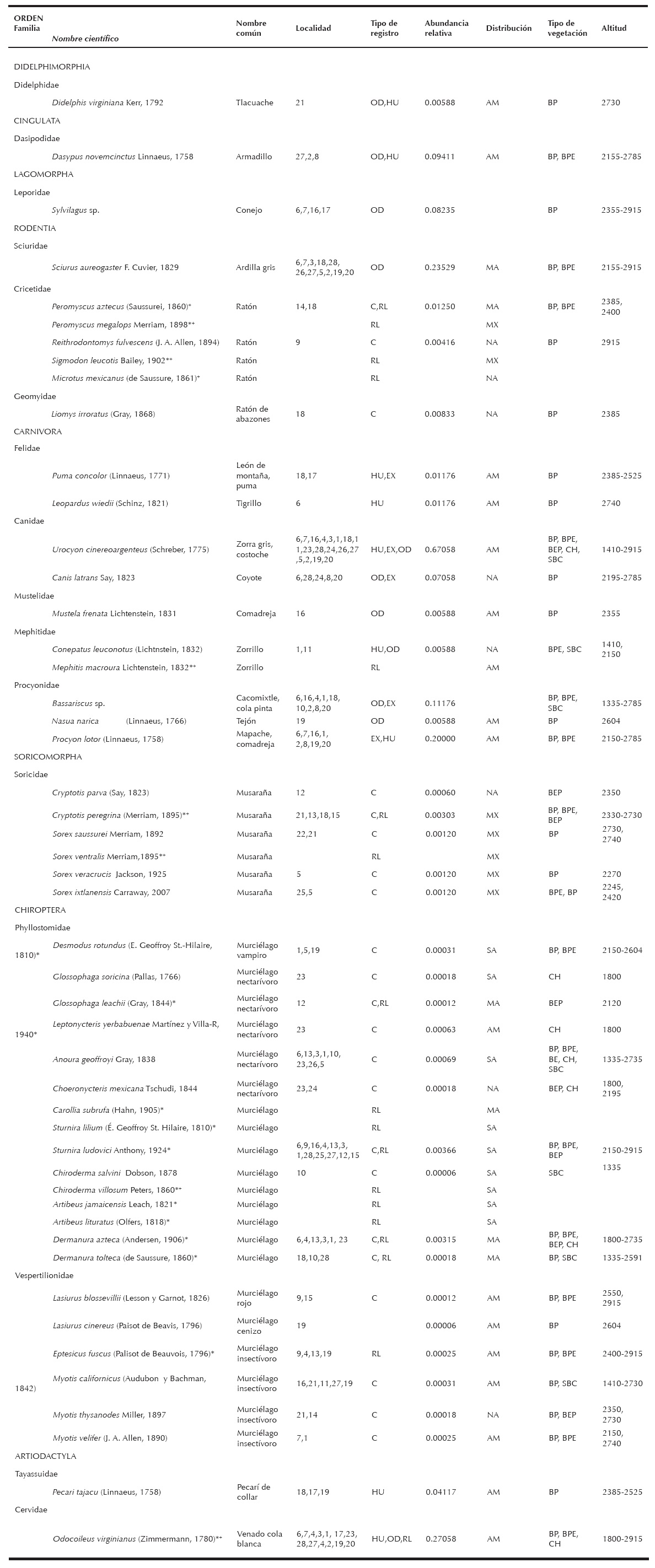 Lista taxonómica de las especies de mamíferos registradas en el centro-occidente de Oaxaca, México. Arreglo sistemático de acuerdo a Ramírez-Pulido et al. (2005), excepto Soricomorpha, que corresponde a Carraway (2007). Tipo de registro: OD, observación directa; HU, huellas; EX, heces; C, captura; RL, revisión de literatura. Distribución: AM, compartida con Norteamérica y Sudamérica; NA, compartida solo con Norteamérica; SA, compartida solo con Sudamérica; MA, endémica a Mesoamérica; MX, endémica a México. Tipo de vegetación: BP, bosque de pino; BPE, bosque de pino-encino; BEP, bosque de encino-pino; SBC, selva baja caducifolia; CH, chaparral.