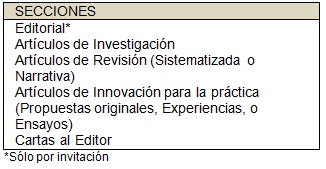 Editorial. En esta sección un experto opina, analiza y reflexiona sobre un tema novedoso que refleje su experiencia, o bien puede estar dirigido a comentar artículos publicados o a los temas tratados en el número respectivo de la revista. Artículos de Investigación. Son documentos que tienen como objetivo difundir resultados de investigación original e inédita. Pueden ser investigaciones cuantitativas (se estudia la asociación o relación entre variables cuantificadas) o cualitativas (se centra en el entendimiento de contextos estructurales y situacionales). Pueden ser en formato breve según la concreción de objetivos y resultados. Artículos de revisión. A) Sistematizada. Tienen como objetivo examinar la investigación publicada sobre un tema en un periodo delimitado y ubicarla en una perspectiva determinada. B). Narrativa o Temática. Su propósito es presentar el tratamiento que se ha otorgado a un tema específico en sus diferentes enfoques o perspectivas. Innovación para la práctica. Dentro de esta sección pueden ser incluidos manuscritos que den a conocer experiencias, reflexiones o propuestas originales, innovadoras y/o relevantes dentro del campo del cuidado, de la gestión (o administración), de la propia investigación o en la educación en enfermería, que hayan marcado o contribuido de manera clara y/o determinante en cambios en esta disciplina. Cartas al editor. Son cartas sobre temas relevantes para la enfermería o bien relacionadas a los artículos publicados en la revista. Los autores de artículos objeto del comentario, tendrán derecho de réplica. POLÍTICAS PARA PUBLICACIÓN. Pueden participar como autores: profesionales, profesores y estudiantes de enfermería, y de otras disciplinas de la salud afines. La Revista considera para su publicación artículos inéditos, reservándose los derechos exclusivos sobre los mismos. Los conceptos, juicios y opiniones expresados en los artículos serán responsabilidad de las y los autores y no reflejan los criterios, políticas o puntos de vista de la institución y la Revista. La recepción de un trabajo no implica la obligación de publicarlo, ni compromiso con respecto a la fecha de su aparición. Los autores son responsables del contenido de cada uno de los artículos incluyendo cualquier cambio sugerido por el comité revisor. PROCESO DE SELECCIÓN. Las contribuciones recibidas pasan por un proceso de selección que dura aproximadamente 4 meses: Dictamen editorial: a la recepción del manuscrito se verifica el cumplimiento de los lineamientos definidos por la revista. Dictamen académico: seguidamente se examina el valor académico y científico del documento mediante un sistema de arbitraje por pares (peer review) realizado por expertos en las distintas materias, nacionales y/o internacionales, externos al Comité Editorial. El editor designa dos árbitros y en caso que sus dictámenes discrepen uno del otro se asigna un tercero. Siendo los dictámenes: "Aprobado", "Aprobado con modificaciones" (Se da 1 mes desde su notificación al autor para reenvío con un máximo de 3 reenvíos) y "No aprobado". En esta fase se protege el anonimato tanto de autores como de revisores. Comité Editorial: con base en los lineamientos de la revista, el valor académico o científico del artículo y la opinión de los árbitros, se define si se publica el artículo o documento presentado. De ser aceptado los Editores se reservan todos los derechos de publicación, por lo que cualquier reproducción parcial o total del texto o ilustraciones requiere autorización previa de los Editores. PREPARACIÓN Y ENVÍO DE MANUSCRITOS