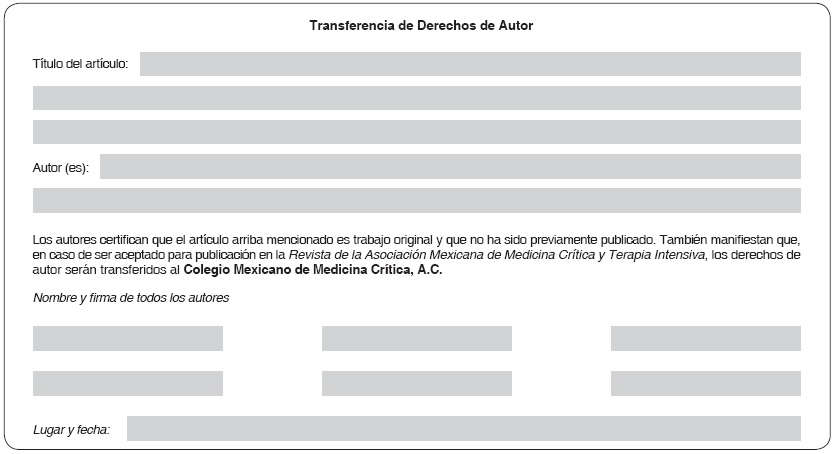 Se recomienda a los autores consultar los requisitos aceptados internacionalmente (formato Vancouver), antes de redactar las referencias. Ilustraciones Todas las ilustraciones aparecerán designadas como figuras para todo el material gráfico: diagramas, dibujos, esquemas, gráficas, fotografías (de pacientes, piezas anatómicas, radiografías, electrocardiogramas, ecocardiogramas, ultrasonografías, etc). Se numerarán con caracteres arábigos por orden de aparición. Los cuadros se rotularán progresivamente con números arábigos por orden de aparición. Las gráficas, dibujos y otras ilustraciones deben dibujarse profesionalmente y fotografiarse en blanco y negro, sobre papel brillante y con dimensiones de 18 x 15.5 cm, 18 x 7.5 cm, 9 x 7.5 cm, o en todo caso proporcionadas a estas medidas. Se evitarán los contrastes excesivos y serán de buena calidad. Identifique cada figura con el apellido del primer autor, número de la figura y una flecha indicando la parte superior. Escriba estos datos sobre etiquetas autoadheribles y péguelas después en la parte posterior de cada figura. Se recomienda que el número de figuras no exceda a seis. Las fotografías en las que aparecen pacientes identificables, deberán acompañarse del permiso escrito para publicación otorgado por el paciente. De no contar con este permiso, una parte del rostro de los pacientes deberá ser tapada sobre la fotografía. Las impresiones a color sólo se publicarán si los autores aceptan pagar su costo. Otros trabajos La extensión de los trabajos de revisión será igual a los de investigación, pero con formato de texto libre y resúmenes escritos a renglón seguido y sin apartados. Las comunicaciones breves, los casos clínicos y cartas tienen instructivos por separado. TRANSFERENCIA DE DERECHOS DE AUTOR El original debe acompañarse de una carta del autor y firmada por los coautores, haciendo constar que el trabajo ha sido revisado y aprobado por todos, y por otra parte, que el trabajo es original y no ha sido previamente publicado. También manifestarán que ceden los derechos de autor al Colegio Mexicano de Medicina Crítica, A.C. de acuerdo con el formato que se anexa.