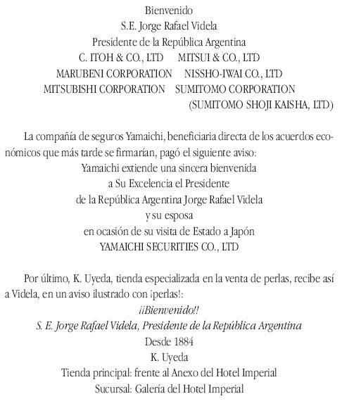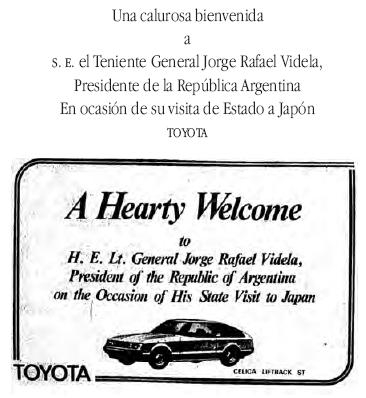 Es interesante analizar el contenido de los mensajes de beneplácito con que los grandes consorcios japoneses dieron la bienvenida al dictador Videla, en inserciones pagadas en The Japan Times. Da qué pensar que sea en el aviso de Toyota la única oportunidad en que aparece el grado de "teniente general" aplicado a Videla. Ilustra el aviso una imagen de un auto fabricado por la empresa, el Celica Liftback.