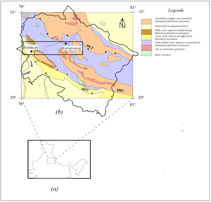 In the Garhwal Himalaya, litho-tectonic units range in age from Precambrian metamorphic to Neogene sediments (Khattri et.al,1989). The Alaknanda River traverses through these litho-tectonic units in the Garhwal Himalaya. The Garhwal Himalaya, drained by the Yamuna, the Bhagirathi, and the Alaknanda rivers constitutes the middle part of Burrard's and Gansser's Kumaun Himalaya extending from the Sutlej to the Kali river (Khattri et.al, 1989). Garhwal Himalaya, comprising the central portion of the Himalaya, is a seismically active region of the Indian subcontinent. It is characterized by the presence of two active fault systems, namely, the Main Boundary Thrust (MBT) and Main Central Thrust (MCT), along with several minor tectonic lineaments.