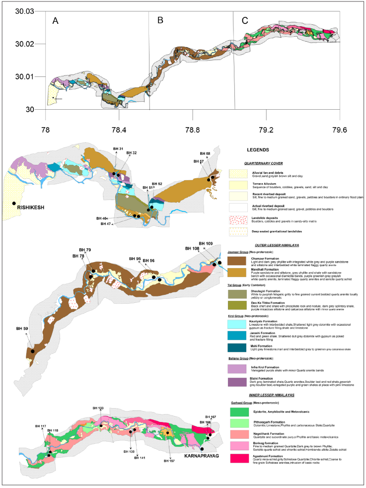 The main rock types in this area are quartzite, phyllite, meta-volcanic, meta basics, and dolomites with strike directions varying from NE-SW to NW-SE. The geological map of the region together with the study area is shown in Figure 2. Quartzites are the major rock type in the area, followed by phyllites and other rocks. Quartzites and dolomites are generally hard and massive in this region except in places where thrust, fault, or shear zones are present. Phyllites and meta basics are of lower strength and have been reduced to powdery material near shear zones. In general, phyllites occupy the southern part of the area close to the North Almora Thrust (NAT) and are commonly crushed, sheared, and crumpled into numerous folds, whereas the quartzites are hard and compact with joints and fractures (Sarkar et al., 1995). A detailed geological map of the study area together with the location of boreholes at which bore log data is available is shown in Figure 2.