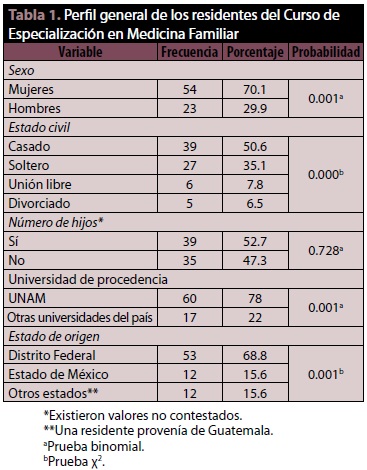 Se aplicaron 77 cuestionarios a residentes del Curso de Especialización en Medicina Familiar. El perfil general de los residentes se muestra en la tabla 1.