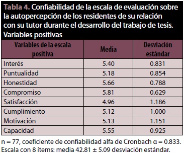 Conclusiones: Los residentes se autoperciben con puntuaciones altas en los aspectos de interés, puntualidad, honestidad, compromiso, satisfacción, cumplimiento, motivación y capacidad; manifestaron puntuaciones bajas en actitud negativa e intolerancia durante el proceso de tutoría. Sin embargo no mostraron una tendencia clara (puntuaciones medias) en su autopercepción en los aspectos de irresponsabilidad, fastidio, frustración y preferencia por no realizar el trabajo de tesis y usar el tiempo en otras actividades. Los resultados conducen a analizar la validez de constructo de los elementos que integraron el contenido teórico del cuestionario utilizado.