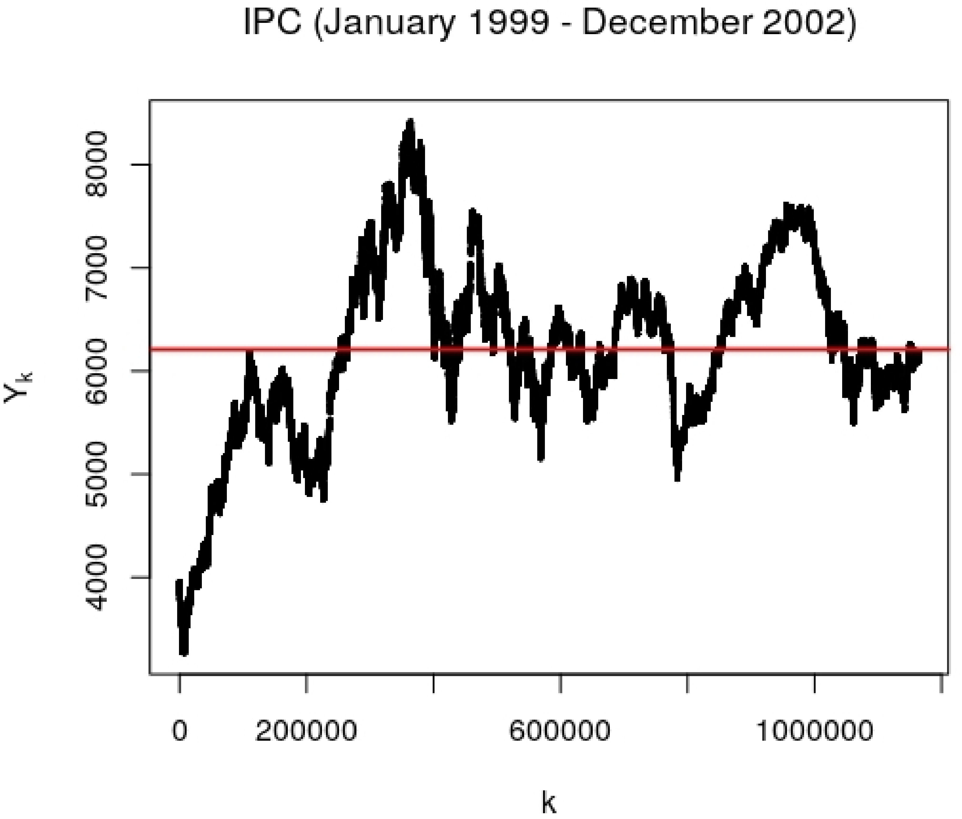The source of the data used in this study were the databases of the National Banking and Securities Commission, the financial body of the Federal Government of Mexico. For our analysis, we used the IPC value over the period January 1999-December 2002, which comprises 4321427 transactions. Taking into account that the Mexican trading day is of six and a half hours, this gives us an average time between transactions of 5.2 seconds. To analyze the statistics of nontrivial index fluctuations, the repeated values (the intervals where no change in the returns was recorded) were filtered, and the set was reduced to N = 1164256 elements with a mean value over the period of 6209.392, a variance of 744334.3, and an excess of kurtosis of 1537.442. These ticks, Y k , are now irregularly sampled, with an average time between fluctuations of 19.3 seconds. This set is plotted in Fig. 1.