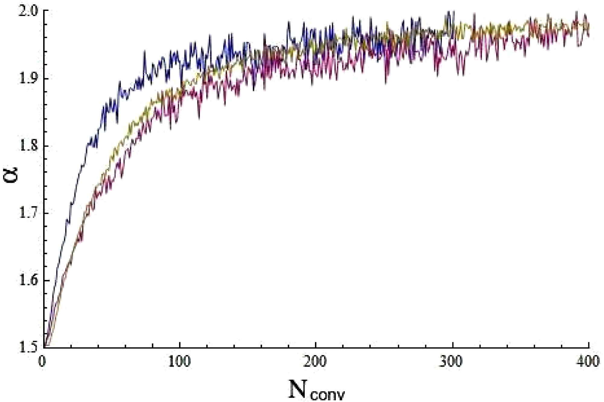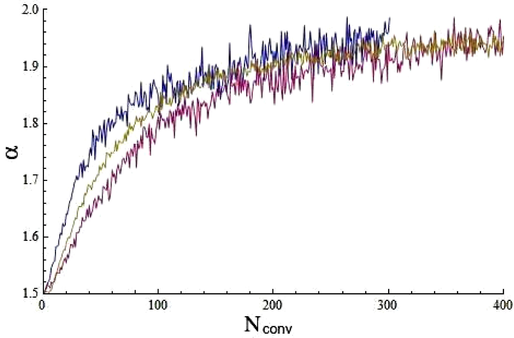 Note in Fig. 5 that α ≈ 2 for N conv around 2000 too. Also, in Table I, it can be seen that the convergence to α = 2 is not just slow, as has been noted previously [9], but it is also non-uniform. We believe that this is an effect of the finite number of elements in the sample. To verify that, we simulated data by truncating sets generated using the stable library by Nolan [16] and following expression (4). For the three sets we used the same parameters, but the length of the series is one, two, and five million elements, respectively. In Fig. 7 is plotted how the stable coefficient α for each original set (without truncation) evolves with convolution.