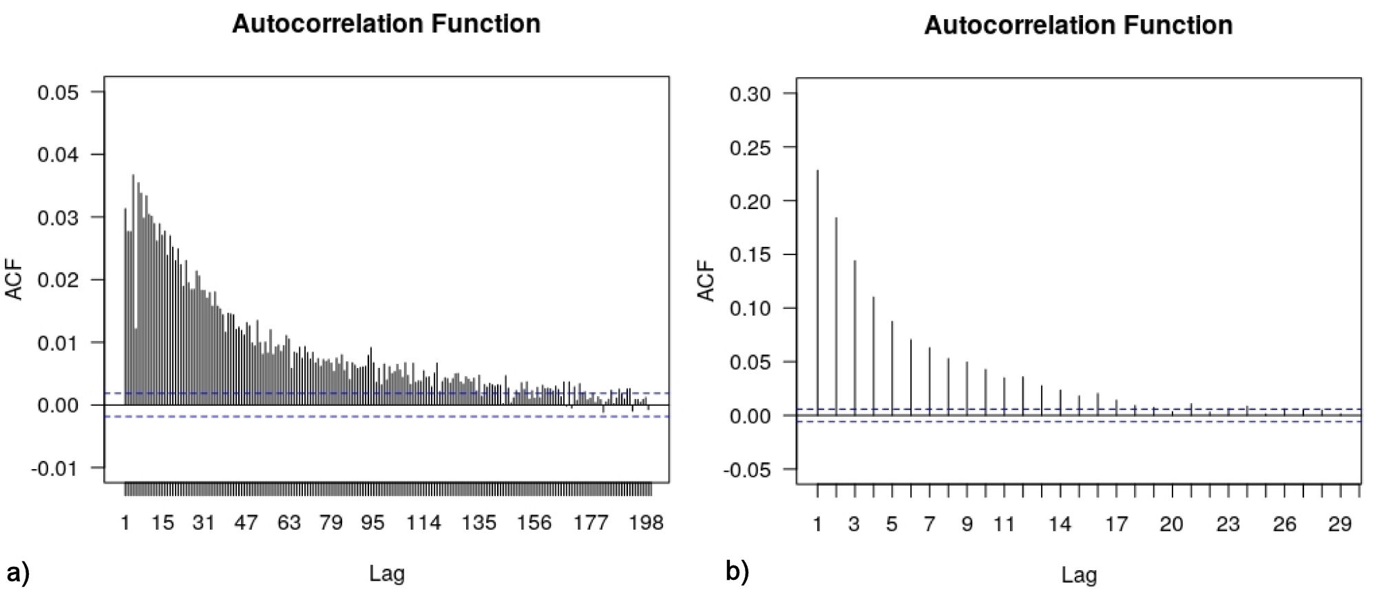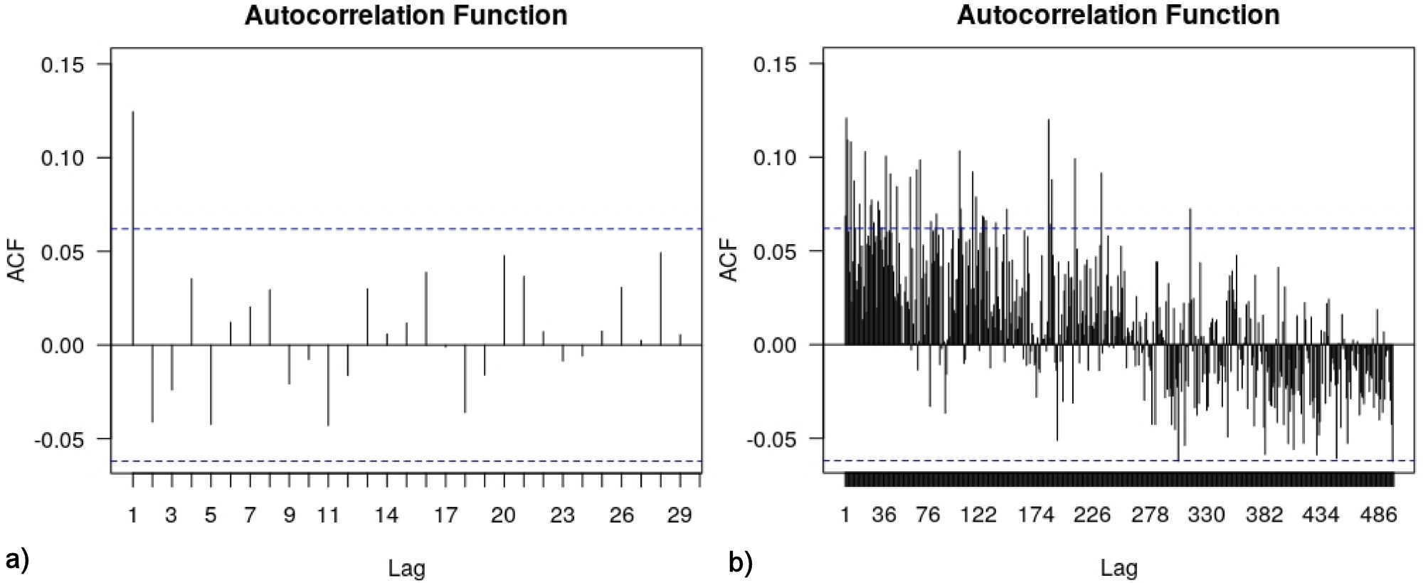 Finally, we present in Fig. 15 the autocorrelations for values and absolute values of the daily closing dataset. As can be observed, these last results are consistent with those obtained for the tick-to-tick set, where no serial dependence is present for sampling intervals above 48 minutes, including, of course, the daily frequency which corresponds to N conv = 1200. Moreover, in Fig. 15a) a mild dependence for the volatility is still observable at a lag of 300 days, which corresponds to the lag of several months observed in Fig. 15b) for the tick-to-tick data.