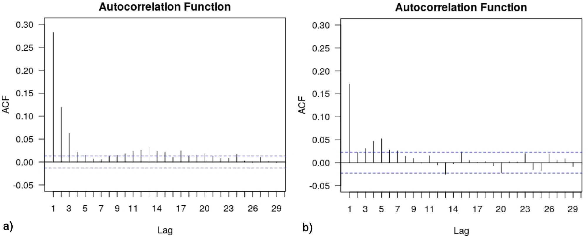 FIGURE 14 Autocorrelations for the absolute value of the returns for a) N conv =0 and b) N conv =150.
