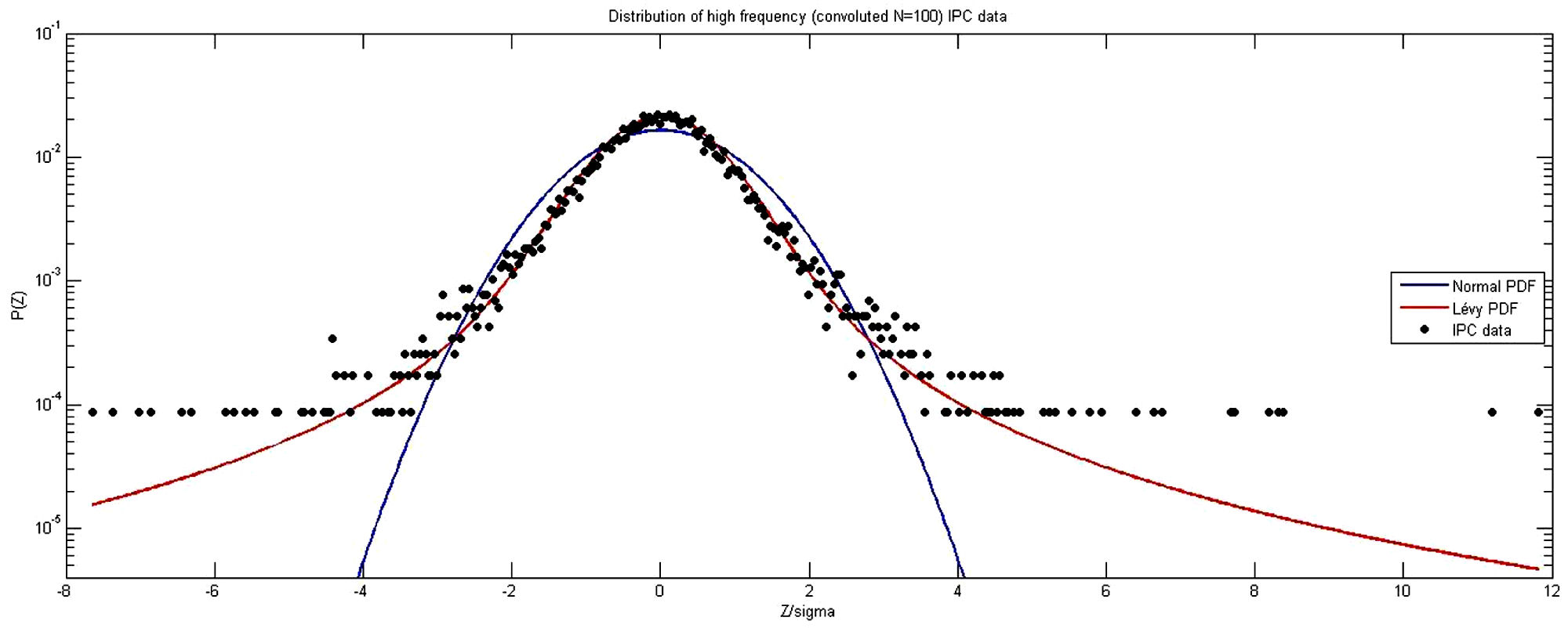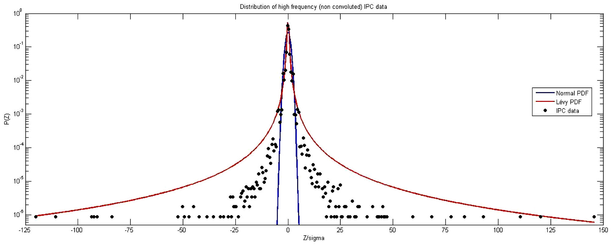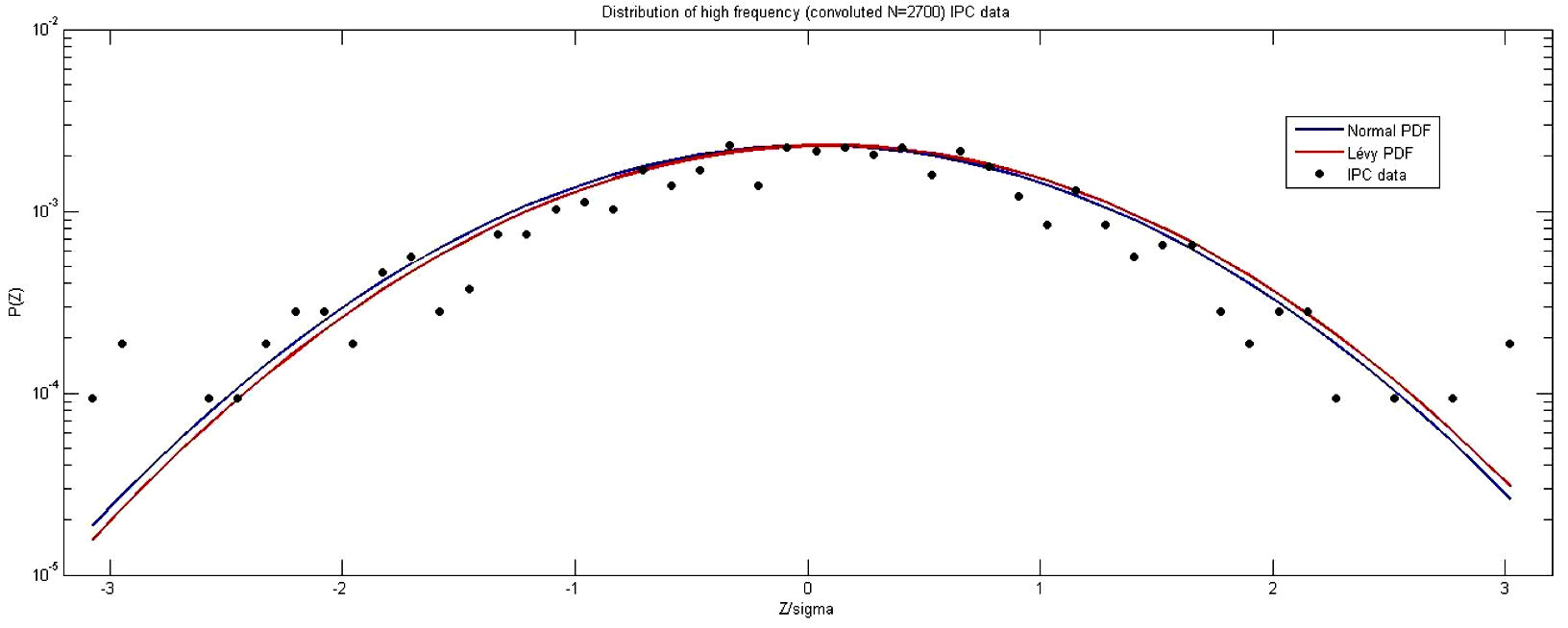We started by analyzing the non-convoluted data. The corresponding distribution is presented in Fig. 2, where a logarithmic scale is used for the vertical axis and the horizontal axis has been rescaled, dividing by the standard deviation. The plots of best fits to a Gaussian (narrow blue curve below the data points) and a Lévy (wide red curve above the data points) distributions are also shown ii .