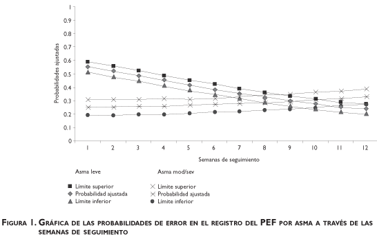 En la figura 1 se observa que la probabilidad de equivocarse en el grupo de padres con hijos que tienen asma leve es mayor que para el grupo de padres con hijos que tienen asma severa durante las primeras semanas de seguimiento. Sin embargo, la probabilidad de equivocarse para los padres que tienen hijos con asma leve disminuye a través del tiempo, al contrario del grupo de padres con hijos que tienen asma moderada o severa. Después de la semana 6 no se encontraron diferencias significativas entre los grupos de padres en cuanto a cometer errores en el registro.