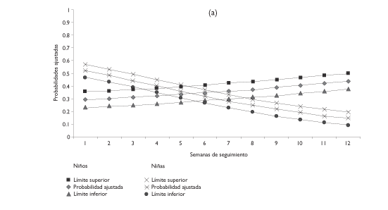 Por otro lado, en la figura 2(a) se observan las probabilidades ajustadas promedio a través del tiempo de seguimiento en interacción con género. Durante las primeras 2 semanas, la probabilidad es menor si tienen hijos varones, sin embargo, aumentan conforme el tiempo de tal manera que de la semana 9 a la 12, los padres de las niñas tienen menor probabilidad de equivocarse.
