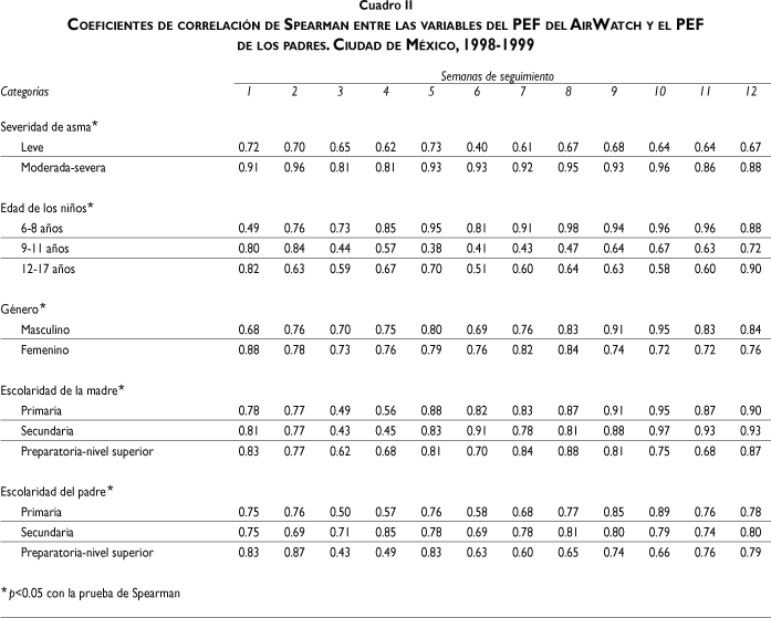 El cuadro II muestra los coeficientes de correlación de Spearman entre el PEF escrito y el PEF electrónico estratificado por severidad de asma, edad de los niños, género, escolaridad de la madre y escolaridad del padre a través de las semanas de seguimiento. Los coeficientes de correlación más cercanos a 1 se observaron en el diagnóstico de asma moderada o severa con valores que van desde r= 0.96 (p<0.05) a r= 0.81 (p<0.05). Los valores más bajos del coeficiente de correlación se observaron en la edad de los niños de 9 a 11 años con un valor mínimo de r= 0.38 (p<0.05) y un valor máximo igual a r= 0.84 (p<0.05).