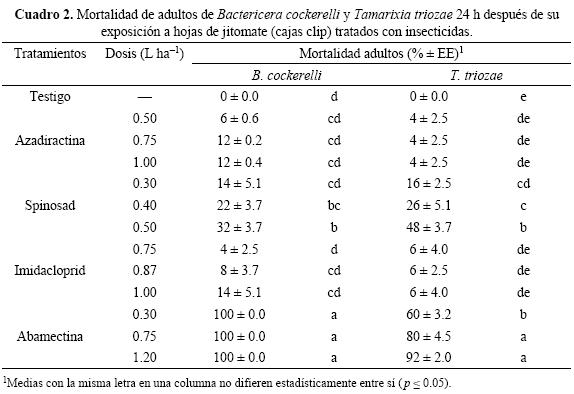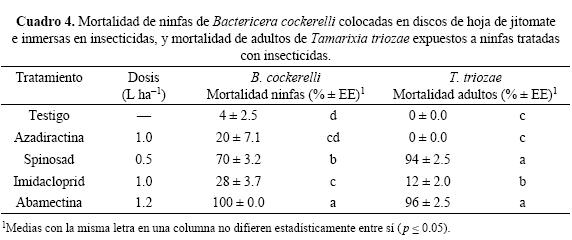 Toxicidad de insecticidas en ninfas de cuarto ínstar del psílido y parasitoides expuestos a discos de hoja de jitomate tratadas con insecticidas. Las ninfas de B. cockerelli y adultos de T. triozae resultaron ser susceptibles a algunos de los insecticidas evaluados, aunque la toxicidad dependió del producto y la dosis aplicada (F4,20 = 165.63; p < 0.001). La abamectina fue el insecticida más tóxico tanto para las ninfas de psílido como para los adultos del parasitoide puesto que causó mortalidad total (100%) a la dosis evaluada (1.2 L ha-1). El spinosad también mostró alta toxicidad para ambas especies aunque, y a diferencia de lo obtenido con los adultos, las ninfas mostraron mayor tolerancia al producto (30% mortalidad). El imidacloprid y azadiractina no mostraron actividad tóxica significativa con respecto al testigo, al ser expuestos a los insectos, de ambas especies, por contacto residual (Cuadro 3).