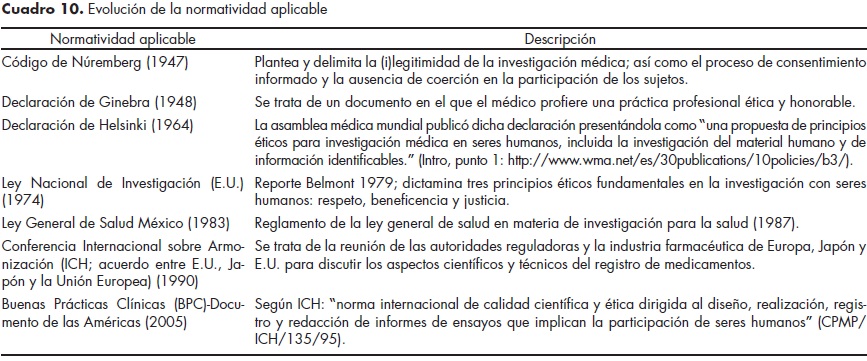 Aunque la investigación de tratamientos data desde antes,59 no fue sino hasta el siglo XX que se reconoció la necesidad de contar con estándares y regulaciones en función de asegurar la protección de los humanos participantes en una investigación.9,10,49 En el cuadro 10 se muestra a detalle una relación de las principales guías desarrolladas para estos fines.58-64 Toda investigación sobre una intervención lleva implícita un importante dilema ético en la calidad de sus resultados, pues éstos fundamentarán una decisión sobre la salud, tanto de los participantes como de los pacientes que potencialmente se verán beneficiados por ésta. En un esfuerzo de estandarización conducido por varias agencias reguladoras de medicamentos en varios países (englobadas como la Conferencia Internacional de Armonización o ICH, por sus siglas en inglés) sobre la investigación con sujetos humanos, se establecieron los Lineamientos de las Buenas Prácticas Clínicas (BPC), en 1990.58