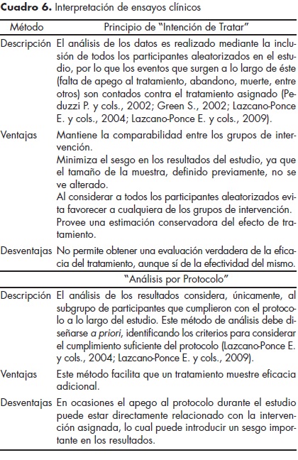 Para la interpretación de los resultados existen al menos dos métodos: el primero se refiere al principio de "intención de tratar", el cual considera la inclusión de todos los participantes aleatorizados en el análisis, a fin de mantener la comparabilidad entre los grupos de intervención;10,23,30,32 el segundo es el "análisis por protocolo", en el que únicamente se considera en los resultados a los que cumplieron con el protocolo a lo largo del estudio10,30 (cuadro 6). Por otro lado, los ECCA pueden tener dos tipos de comparación de resultados: los estudios de superioridad y los de no inferioridad. Los primeros identifican superioridad de una intervención en términos de eficacia; los segundos muestran que el tratamiento experimental no es peor que el tratamiento estándar. Ambos tipos de estudio se explican con mayor detalle en el cuadro 7. La opción a elegir dependerá de la relevancia clínica y no de la estadística.10,30