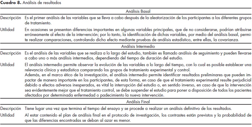 En un ensayo clínico controlado aleatorizado se lleva a cabo más de un análisis de datos a lo largo del estudio, en general éstos pueden dividirse en tres: análisis basal, intermedio o de seguimiento y análisis final. Cabe señalar que cada uno constituye un elemento imprescindible para la obtención válida y confiable de los resultados finales31 (cuadro 8).