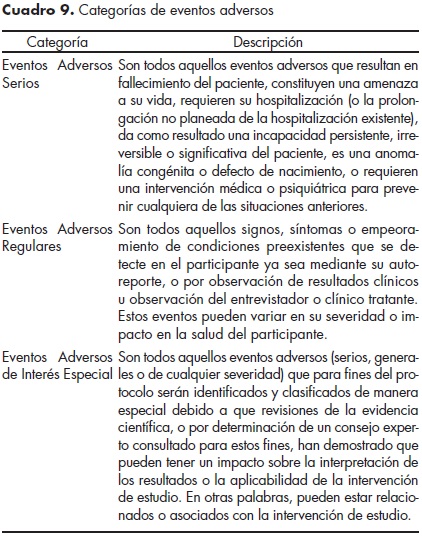 La evidencia que respalda la decisión clínica de utilizar una intervención sobre otra se constituye en la misma dimensión tanto por su eficacia o efectividad demostrada como por sus posibles efectos iatrogénicos, o no-deseados, en todas las poblaciones de pacientes donde potencialmente pueda aplicarse. Por esto es un requisito regulatorio en la conducción de ensayos clínicos el contar con un mecanismo o sistema de recolección de datos acerca de todos estos efectos en los participantes. Durante la conducción de un ECCA a todos estos efectos no-deseados se les identifica bajo la designación de "eventos adversos".9,10,49 En el tratamiento de las adicciones y de otros trastornos de la salud mental los pacientes tienen un alto riesgo de presentar afecciones renales, cardiacas o respiratorias e infecciones asociadas al consumo; así como accidentes, conductas sexuales de riesgo, comportamiento violento o problemas con la ley debidos al abuso de sustancias; además de una exacerbación de la sintomatología psiquiátrica, o incluso conductas suicidas, causadas por el consumo de alcohol o de drogas1,5,8,15,50,51 o dificultades en el funcionamiento familiar, laboral o social del sujeto.52 La conducción de un ECCA debe contemplar un plan acorde para la identificación, evaluación, seguimiento y reporte de posibles eventos adversos. Los mecanismos o herramientas que se utilicen para llevar a cabo este monitoreo de seguridad deberán ser parte del protocolo de investigación.9,52 En el cuadro 9 se muestra una propuesta de las distintas categorías de eventos adversos que deben identificarse en los participantes de un ECCA.9 Todo conocimiento que tengan los investigadores acerca de los posibles riesgos o eventos adversos que se detecten y que están relacionados con la intervención de estudio debe ser informado a las instancias regulatorias aplicables (p.ej. comités de ética institucionales) y, si se considera necesario, a todos los participantes del estudio.