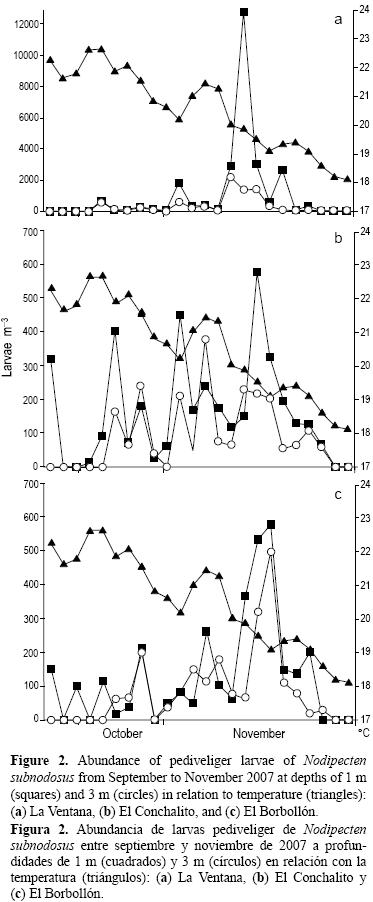 La temperatura del agua decreció de 24 °C en septiembre a 16 °C en diciembre de 2007 (fig. 2ac). No hubo diferencias significativas entre temperaturas en los diferentes sitios en el mismo mes. Con excepción de septiembre, se observaron larvas pediveliger durante la mayor parte del periodo de muestreo (fig. 2ac). Se observaron picos de densidad larvaria en octubre y noviembre, registrándose la mayor densidad de larvas (12,400 larvas m3) en noviembre a 1 m de profundidad en LV (fig. 2a). En EC y BB se registraron densidades máximas de 571 y 580 larvas m3 (fig. 2bc), respectivamente, también en noviembre. La densidad de larvas no difirió significativamente entre profundades y entre EC y BB, mientras que LV mostró una densidad larvaria significativamente mayor (P < 0.05).
