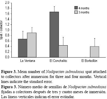 Los colectores de semilla consistieron de bolsas de nilón (polifilamento de polipropileno) de 2 mm de luz de malla con una malla Netlon azul de 2 m que es ampliamente utilizada para la captación de semilla de bivalvos. Se instalaron un total de 150 colectores en octubre de 2007 y 150 en noviembre de 2007. Se amarraron tres colectores a una cuerda, cubriendo desde la superficie hasta 3 m de profundidad para evitar que los colectores alcanzaran el fondo durante la marea baja. Los colectores fueron instalados durante el pico anual de actividad reproductiva (ArellanoMartínez et al. 2004), cuando ya se habían recolectado larvas en las muestras de agua de cada sitio. Después de un mes se retiraron aleatoriamente seis colectores de cada sitio y no se obervó reclutamiento; por lo tanto, los demás colectores fueron retirados en febrero de 2008 después de estar sumergidos tres o cuatro meses. Se colocaron los colectores en bolsas de plástico y se transportaron al laboratorio para el análisis de reclutamiento. Las almejas fijadas a la malla se desprendieron de forma manual. Los residuos restantes en los colectores fueron tamizados a través de mallas de varios tamaños. Las semillas en los residuos se juntaron con las semillas desprendidadas manualmente para determinar la abundancia en cada sitio. Para evaluar la distribución de tallas, los organismos jóvenes se midieron con un analizador digital de imágenes bajo un microscopio óptico.