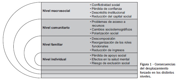 El desplazamiento de amplios sectores de la población produce impactos a nivel a) individual, b) familiar, c) comunitario y d) macrosocial. Desde una perspectiva ecológica todos estos niveles se encuentran interelacionados y tienen capacidad para afectarse mutuamente (Bronfenbrenner, 1981). Esta lógica implica que las alteraciones que el desplazamiento produce sobre el individuo pueden trasladarse también a las dinámicas familiares y al contexto comunitario, para acabar afectando a la sociedad en su conjunto. Por tanto, desde un enfoque sistémico resulta necesario examinar las consecuencias del desplazamiento a cada nivel para comprender los efectos reales de este fenómeno complejo y dinámico (Restrepo et al., 2003).