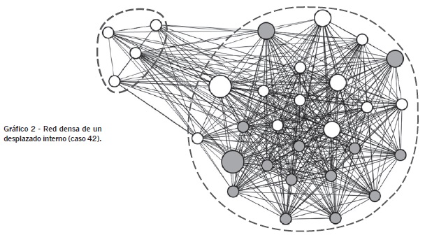 El gráfico 2 es la red personal densa de un desplazado interno. Omar tiene 38 años y lleva cinco en condición de desplazado, de los cuáles cuatro ha vivido en Barranquilla. Tiene educación primaria y sus ingresos están por debajo del salario mínimo interprofesional. Su red personal está formada por un único componente densamente conectado, equilibrada en términos de composición. Sólo destaca un pequeño grupo de cuatro actores que viven en su localidad de origen y con los que mantiene contacto, pese a que no son los más polivalentes en términos de apoyo. Relativamente en poco tiempo de reasentamiento, Omar parece haberse incorporado a un núcleo social activo, aunque su espacio de relación parece limitado a un único contexto social de referencia.