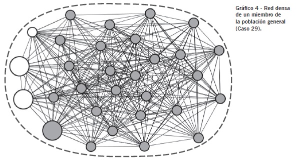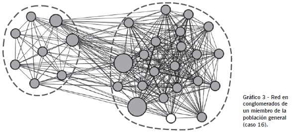 El gráfico 3 es una red personal en conglomerados de un representante de la población general. Amalio es un barranquillero de 30 años, cuyas relaciones se concentran en el entorno local inmediato. Todos excepto uno de los miembros de su red personal son barranquilleros. Sus relaciones se dividen en dos agrupaciones: la primera está compuesta mayoritariamente por familiares y por integrantes de la parroquia local de la que es feligrés; la segunda agrupación, que supone casi el 30 por ciento de la red personal corresponde a compañeros de trabajo. Las dos esferas sociales de Amalio quedan claramente reflejadas en la estructura de su red personal.