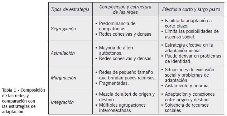 La estrategia de segregación puede garantizar la adaptación inicial del desplazado, gracias a que le proporciona estabilidad y medios de subsistencia inmediatos, pero a largo plazo puede erigirse en un factor que limita el acceso a contactos y espacios sociales diversos, dificultando las posibilidades de acceder a nuevas fuentes de apoyo y recursos. La asimilación refleja el caso contrario en el que predominan los miembros de la comunidad de destino, en este caso al igual que en la estrategia anterior, la estructura de la red aporta recursos de valor, aunque esta estrategia puede impulsar la obtención de nuevos contactos, a veces puede darse a costa del apoyo de miembros del contexto de origen, preservando o reconfigurando su identidad social como desplazado.