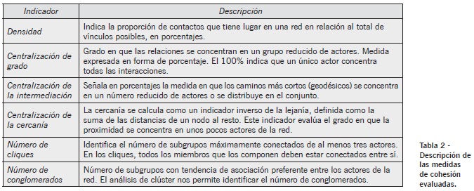 Con el objetivo de caracterizar las redes analizamos múltiples indicadores de cohesión (McCarty, 2002). En la tabla 2 se describen las medidas empleadas.