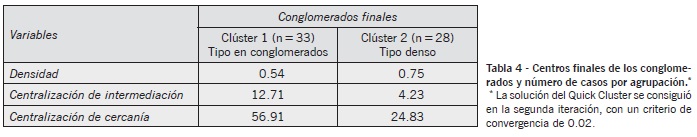 Con el objetivo de identificar con mayor claridad las características de las redes de ambas poblaciones llevamos a cabo un análisis de clúster por el procedimiento de las K-Medias (Kaufman y Rousseeuw, 2008). Este procedimiento permite identificar agrupaciones (clústeres) cuyas características son desconocidas, pero están basadas en variables preestablecidas por los investigadores. En este caso utilizamos como variables de agrupación: la densidad, la centralización de la intermediación y la centralización de la cercanía. Según McCarty (2002) estos indicadores permiten establecer comparaciones entre redes personales de forma efectiva. En la tabla 4 presentamos los resultados para cada subgrupo identificando los centros finales de los conglomerados y el número de casos asignado a cada agrupación.