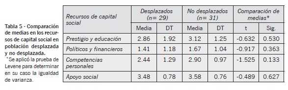 El subgrupo de desplazados internos no difieren en los recursos de capital social disponibles en comparación con la población local, ya sea tomando como referencia un indicador agregado de la escala GRCS (t= -1.112, p= .271) o los factores que la componen (véase tabla 5).
