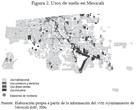 La ciudad de Mexicali cuenta con un sistema de monitoreo atmosférico que se conforma por seis estaciones; en la figura 2 se muestra su ubicación, en tanto que el cuadro 2 describe la relación entre las mismas y los usos de suelo circundantes. Los contaminantes moni toreados básicamente son ozono (O3), monóxido de carbono (CO), dióxido de azufre (SO2), dióxido de nitrógeno (NO2) y material particulado (PM10), esto derivado de un acuerdo entre los gobiernos de Estados Unidos de América y México a través del programa Binacional Frontera XXI, que posteriormente se convirtió en Programa Frontera 2012. En el caso de las estaciones Progreso y Conalep, solamente miden PM10. Es conveniente anotar que si bien la estación CBTIS deja de operar a partir del 2002 para ser reubicada al sur de la ciudad en el 2005, bajo el nombre de Campestre, su inclusión en el estudio es importante ya que arroja información valiosa de la calidad de aire en su área de influencia entre 1997 y 2001.