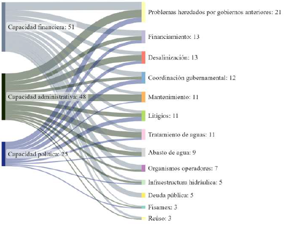 Para examinar la información obtenida se empleó el análisis del discurso: se codificaron tanto las entrevistas como las sesiones mañaneras con el software ATLAS.ti. Dicha codificación consistió en agrupar los principales problemas de orden público y su relación con cada uno de los niveles de la capacidad institucional. Este análisis ayudó a entender los enlaces entre las instituciones y la ruta de acción del gobierno respecto al manejo de los recursos hídricos.