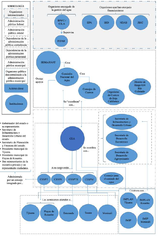 En este sentido, el aporte de Rosas Huerta (2008) permite establecer una guía y una estructura analítica. Sin embargo, “puede afirmarse que cualquier evaluación que se realice en torno a la capacidad institucional deberá definir primero qué es lo que entiende por dicha capacidad, ya que dependiendo de la definición es lo que se valora” (Rosas Huerta, 2008, p. 126). Entonces, se consideran tres aspectos esenciales para el análisis de la capacidad institucional de la gestión del agua: 1) las reglas, leyes y normas que permiten la interacción política entre actores del Estado (Vázquez Lee, 2020); 2) los aspectos de carácter administrativo asociados a las habilidades técnico-burocráticas de quienes toman las decisiones, así como de sus formas de organización (Rosas Huerta, 2008), y 3) la capacidad financiera que permite identificar el nivel de dependencia de los gobiernos e instituciones (Pineda Pablos et al., 2019). En conjunto, dichos aspectos permiten determinar la apropiación de los problemas públicos en la gestión urbana de agua en Baja California y analizar las acciones a través de las responsabilidades de las instituciones y de los actores clave.